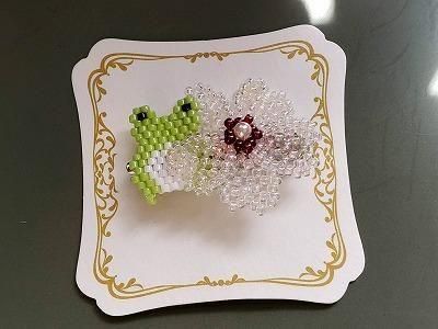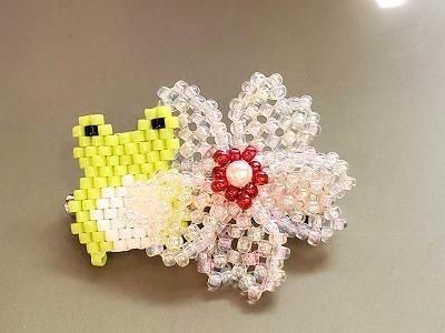 刺繍ビーズミニブローチ カエルと桜